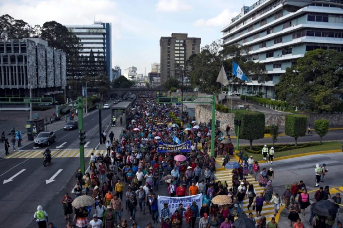 Miles de comerciantes de La Terminal, el mercado popular más grande de Guatemala y Centroamérica, se manifiestan en Ciudad de Gatemala a favor del presidente Jimmy Morales, el 2 de mayo de 2018 © AFP Johan ORDONEZ