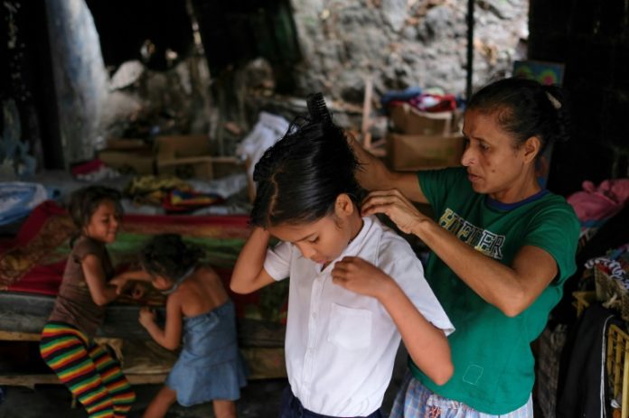 En un endeble rancho, al borde de un cerro de Caracas, peina a sus hijas menores para enviarlas al colegio.