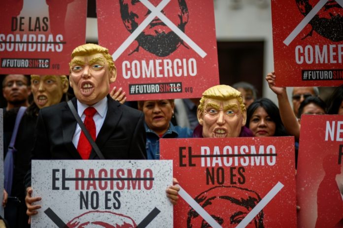 México (AFP) – Usando máscaras de Donald Trump, unas 20 personas exigieron suspender la renegociación del tratado norteamericano de libre comercio (TLCAN) alegando «opacidad» en las tratativas e indignación por los ataques del mandatario estadounidense contra los mexicanos.